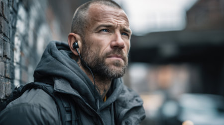 A man with a beard wearing a hoodie stands against a brick wall, listening to music through earbuds. The background reveals a blurred cityscape on a cloudy day.