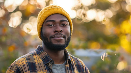 Thoughtful Black, bearded hipster male dressed in a fleece shirt and baseball cap.