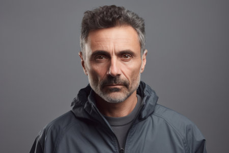 Headshot of thoughtful bearded man posing outdoor wears denim jacket. Vertical.