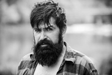 Bearded lumberjack checkered clothes. Brutal man walk in forest. Hipster lifestyle. Masculinity and brutality. Lumberjack style. Stylish guy lumberjack