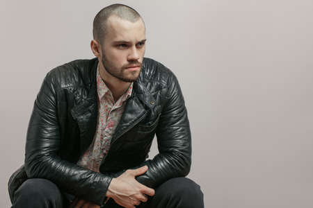 gorgeous powerful man is sitting and thinking about something. yhoughtful, pensive man in fashion clothes. close up side vieww portrait. copyspace