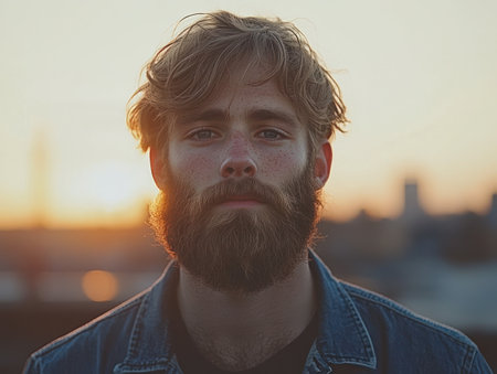 A man with a full beard stands on a rooftop during sunset, looking contemplative and serene.