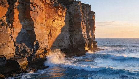 Dramatic coastal scene depicts towering rock formations beside a wavy ocean under a colorful sunset. The image displays warm sunlight and cool shadows across the scene. The composition may be suitable for travel, nature, or environmental themes, and ideal for commercial purposes.