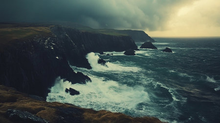 A dramatic cliffside view overlooking a turbulent oceanic seascape with crashing waves and foaming surf under an ominous brooding sky filled with moody atmospheric clouds This grand