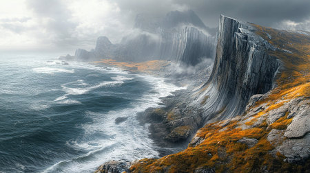 the awe-inspiring beauty of coastal cliffs, as they stand tall and rugged against the crashing waves below. towering cliffs and the power of the ocean, creates a sense of awe and wonder