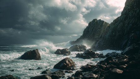 Dramatic Coastal Scene with Waves Crashing on Rocky Shore