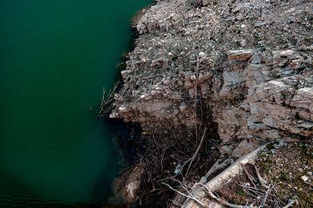 Lake formation in an old abandoned quarry. Quarry lake. Crushed stone dumps in a closed area for stone extraction. Termination of mining operations.