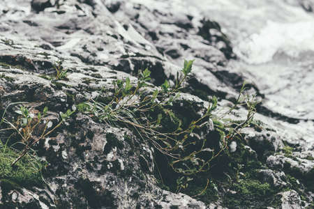 Green plant on the rock, the struggle for life. The loneliness, the fast life.