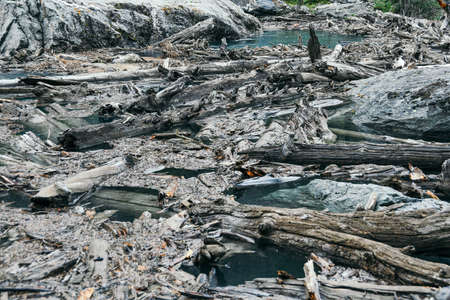 Jam of old trees on the river. Water dam of trunks and pollution of nature