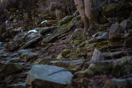 shore of a mountain river with stones overgrown with moss roots of a tree that sprouted in a rock in a mountainous area in early spring the weather is clear near the tree remnants of fallen dry leaves