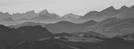 Breathtaking panoramic view of a misty mountainous landscape with a serene atmospheric valley and hazy peaks in the distance This stunning natural scenery evokes a sense of tranquility and adventure
