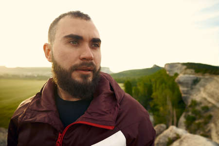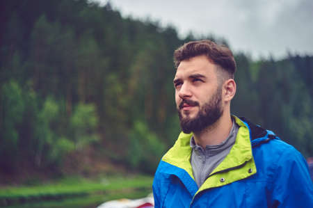 Portrait of a young, bearded man, on, against a background of wildlife. The concept of expedition, adventure and camping life.