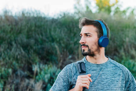 Young man wearing sportswear and bag, walking down the street on his way to the gym, while listening to puss with his blue headphones.