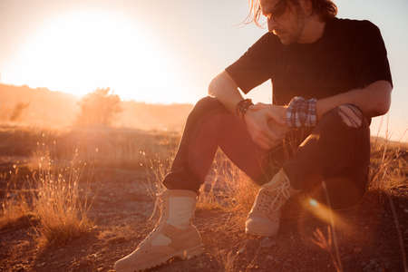 pensive man in the setting sun sits on the ground