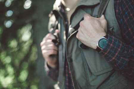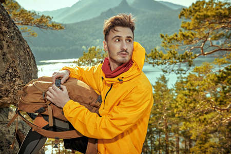 attractive male is going to explore the mountains. close up photo. copy space