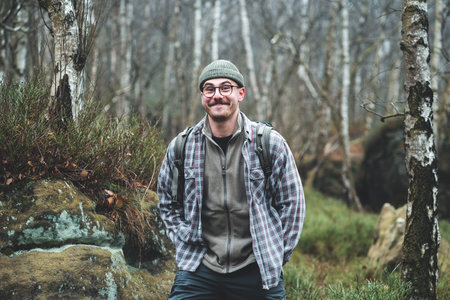 Happy young man smiling with a backpack, stands near rocks and looks straight to the camera, the trees in a mountain gorge. Trekking the trail in the mountains, Czech Republic, Bohemian Switzerland