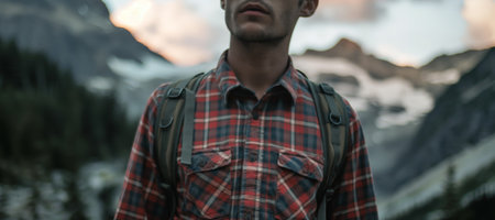 Lone Hiker in Plaid Shirt Exploring Mountain Wilderness at Dusk.