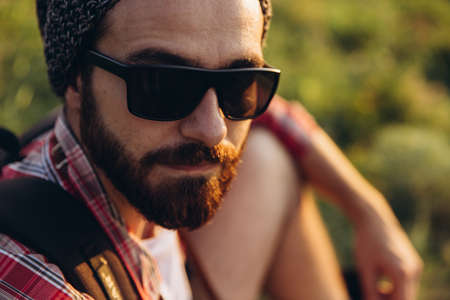 Fashion portrait of a bearded hipster young man wearing sunglasses, a backpack and hat on a background with copyspase in the mountains at sunset .. A confident man with a beard.