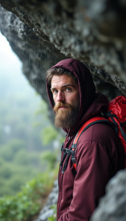 A rugged man with a thick beard and a maroon hoodie gazes thoughtfully from a rocky overhang, rain cascading around him. His intense expression reflects resilience and contemplation, embodying the spirit of adventure amidst natures challenges.