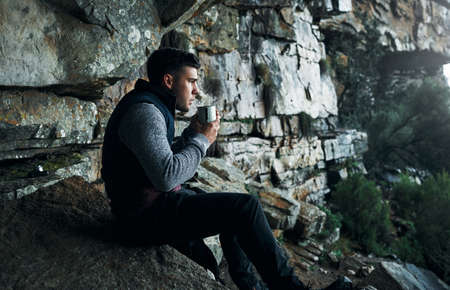 Theres no WiFi here, but youll still make a good connection. Shot of a young man drinking coffee while hiking through the mountains.