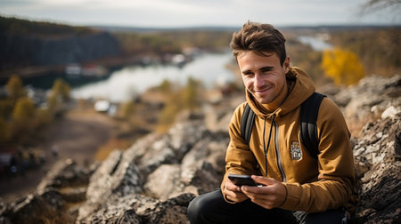 On a beautiful spring day, a young man in a sweater watches the quarry and the lake while holding his phone in his hands. GENERATE AI