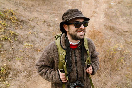 Happy handsome photographer in sunglasses walking with digital camera outdoors