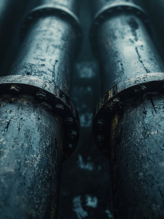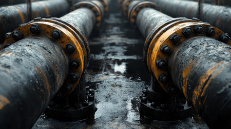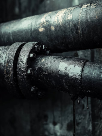 Large industrial pipes exhibit signs of wear with black oil dripping from joints in a damp, industrial setting, emphasizing deterioration.