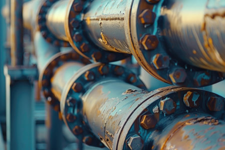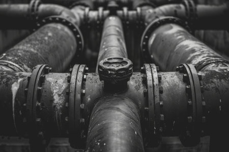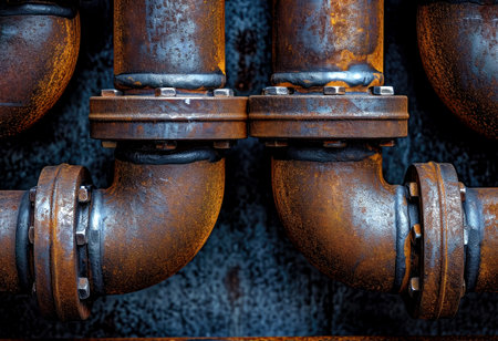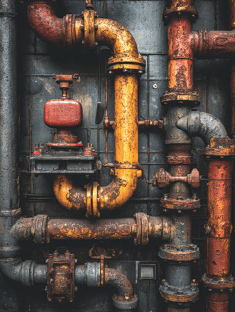 Heavy-duty pipes and valves of various sizes intertwine against a rusty background, highlighting the texture and aging process of industrial machinery.