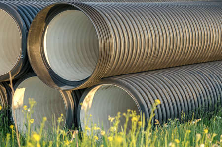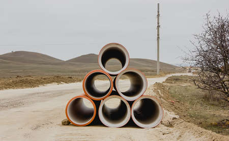 Pipes of PVC large diameter prepared for laying on construction site