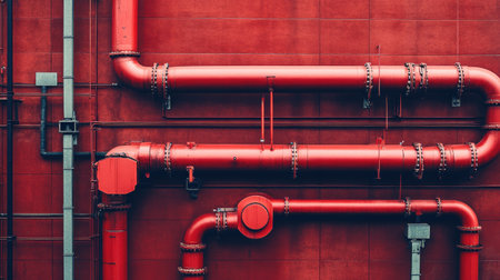 A captivating image showcasing red industrial pipes arranged against a striking wall. This unique composition highlights urban design, serving as ideal background material for creative projects and advertising.