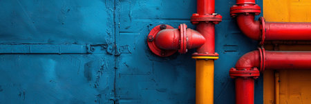 Red and yellow water pipes on a blue wall, panoramic