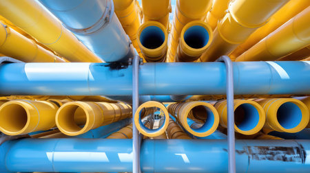 Bright yellow industrial pipes on a vibrant blue background, showcasing modern engineering with intricate connectors and shadows for visual interest