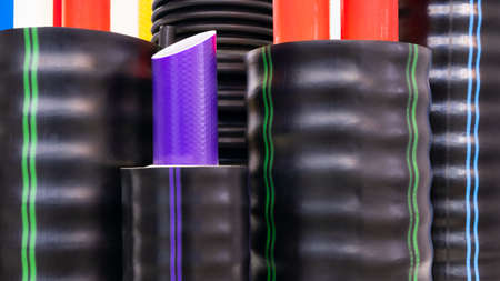 background of colorful big plastic pipes used at the building site close-up frontal view
