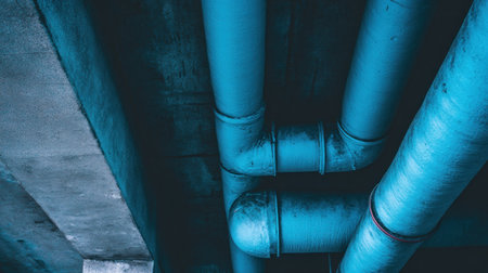 Array of industrial pipes in factory energy facility power plant sewage pipe oil refinery pipe power production chemical manufacturing gasoline gas heat heavy industries modern building