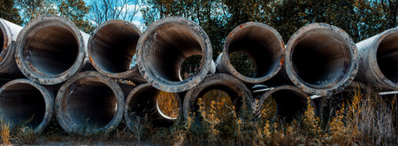 Abandoned stacked concrete pipes. Panoramic banner view.