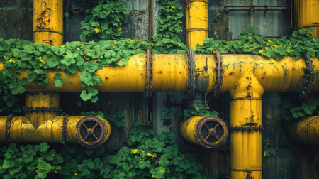 Lush green foliage contrasting with yellow industrial pipes, showcasing the striking contrast between nature and machinery in an industrial setting.