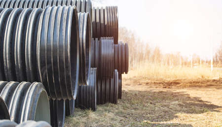 Large diameter black polypropylene pipes for laying communications, drainage systems and heating mains under the road. Modern method and technology for supplying water and sewage, copy space