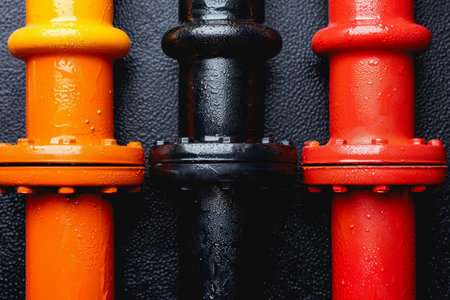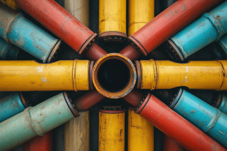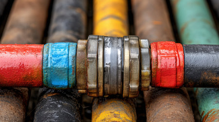 A close-up view capturing colorful industrial pipes with a shiny metallic coupling, showcasing textures and details on a construction site.