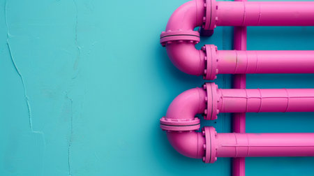 A pink pipe is attached to a blue wall, creating a striking contrast between the two colors. The pipe appears to be in good condition, with no visible signs of damage or wear.