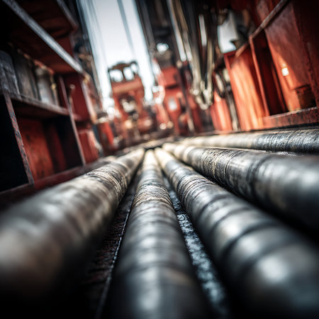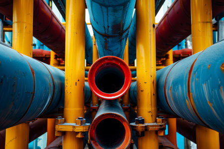Steel pipes in an industrial setting used for transporting energy resources like oil and water. Concept Industrial Piping, Energy Transportation, Steel Pipes, Oil Industry, Water Distribution