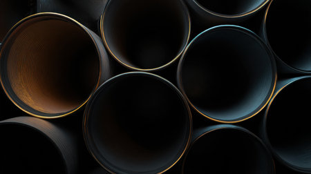 This image showcases a close-up view of dark pipes with circular openings, highlighting the industrial design and smooth textures in a captivating geometric arrangement.