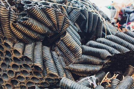 stack of black drainage pipe construction concept background, black and white tone
