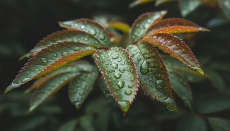 A detailed, intimate perspective on a cluster of young plant leaves, adorned with numerous glistening water droplets. The foliage displays a beautiful transition of colors, from vibrant green at the base to warmer rust and amber tones at the tips and edges. Each leaf is sharply defined, showcasing delicate veins and a slightly serrated margin, with the tiny spheres of water reflecting ambient light. The dark, softly blurred background ensures the focus remains entirely on the textured, wet leaves, evoking a sense of natural freshness, growth, and the beauty of the outdoors after precipitation or during a dewy morning. This capture emphasizes the intricate beauty found in botanical elements.