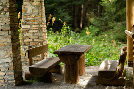 Photo of a wood bench of relaxing corner in the forest on the mountain at Hellfire pass, Kanchanaburi, Thailand