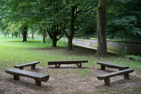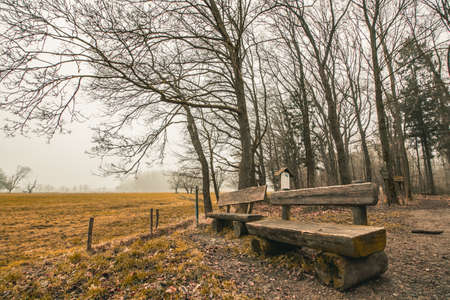 A beautiful shot of wooden benches in a forest park with a gloomy sky in the background