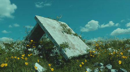 Broken stone slab in scenic meadow of wildflowers under a blue sky