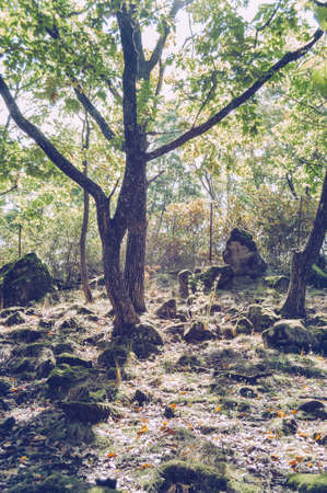 Old broken bench in the forest with peeling paint. Small focus at the beginning of the bench. Tinted. Horizontal.