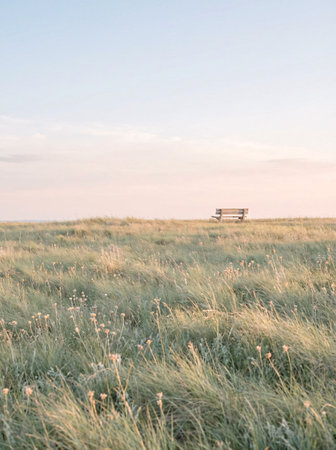 Lonely bench on the edge of a beach in evening. Wooden beach at a beach surrounded by bushes and trees.