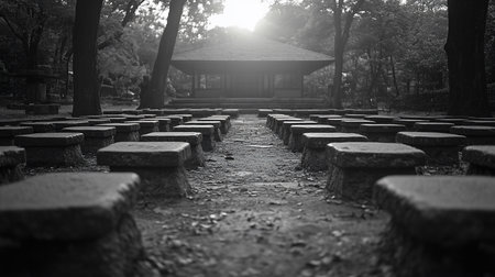 A black and white image of a Japanese garden featuring rows of stone seats leading to a traditional pavilion, bathed in soft, diffused light, creating a peaceful and contemplative atmosphere.