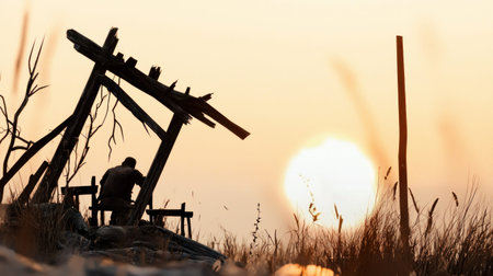 A contemplative figure silhouetted against a vibrant sunset, seated at a rustic table, evoking a sense of solitude and reflection.